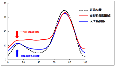黒の破線が正常な膝、赤の実線が重度変形性膝関節症、青の実線が人工膝関節置換術後です。